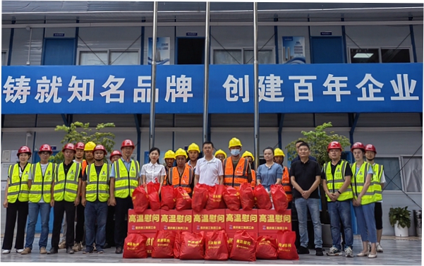 熱浪襲人,驕陽似火,持續高溫悶熱天氣,給堅守一線的施工人員帶來了嚴峻“烤”驗,一線職工的生產、生活狀況時刻牽動著集團領導的心。8月2日,集團黨委副書記、總經理周進頂著烈日前往由市政事業部施工的大田灣片區市政工程項目,看望慰問在高溫酷暑中堅守崗位的一線工作人員,向他們致以真誠的問候和衷心的感謝,并把防暑降溫用品親自送到工作人員手中。