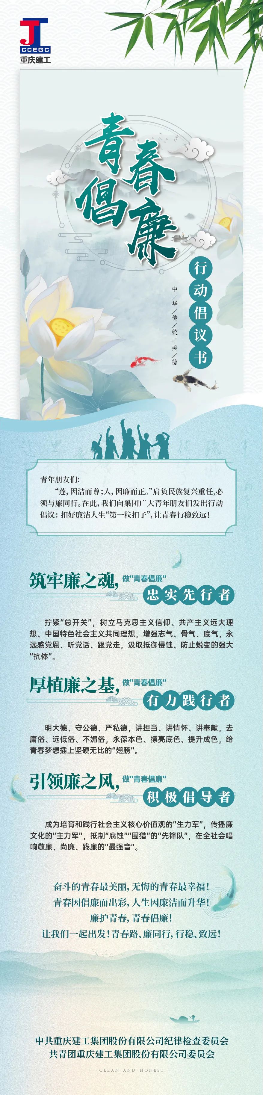 為深學(xué)篤用習(xí)近平新時代中國特色社會主義思想,深入學(xué)習(xí)貫徹十九屆中央紀(jì)委六次全會精神,全面貫徹落實《中共中央辦公廳印發(fā)<關(guān)于加強新時代廉潔文化建設(shè)的意見>的通知》(中辦發(fā)〔2022〕3號)精神,一體推進不敢腐、不能腐、不想腐,進一步加強集團年輕干部教育管理監(jiān)督,推動“青春倡廉”行動扎實開展,引領(lǐng)廣大青年踐行社會主義核心價值觀,倡樹“知廉、敬廉、尚廉、踐廉”新風(fēng)尚,扣好“人生的第一粒扣子”。集團紀(jì)委、團委將在全集團范圍內(nèi)聯(lián)合開展2022年重慶建工集團“青春倡廉”行動,現(xiàn)倡議如下: