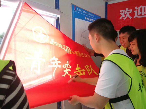 6月6日,重慶建工四建公司第二項目部團支部在貴州格凸河項目工地舉行了青年突擊隊授旗儀式,12名突擊隊員,同舉右手,面對青年突擊隊隊旗激昂宣誓。