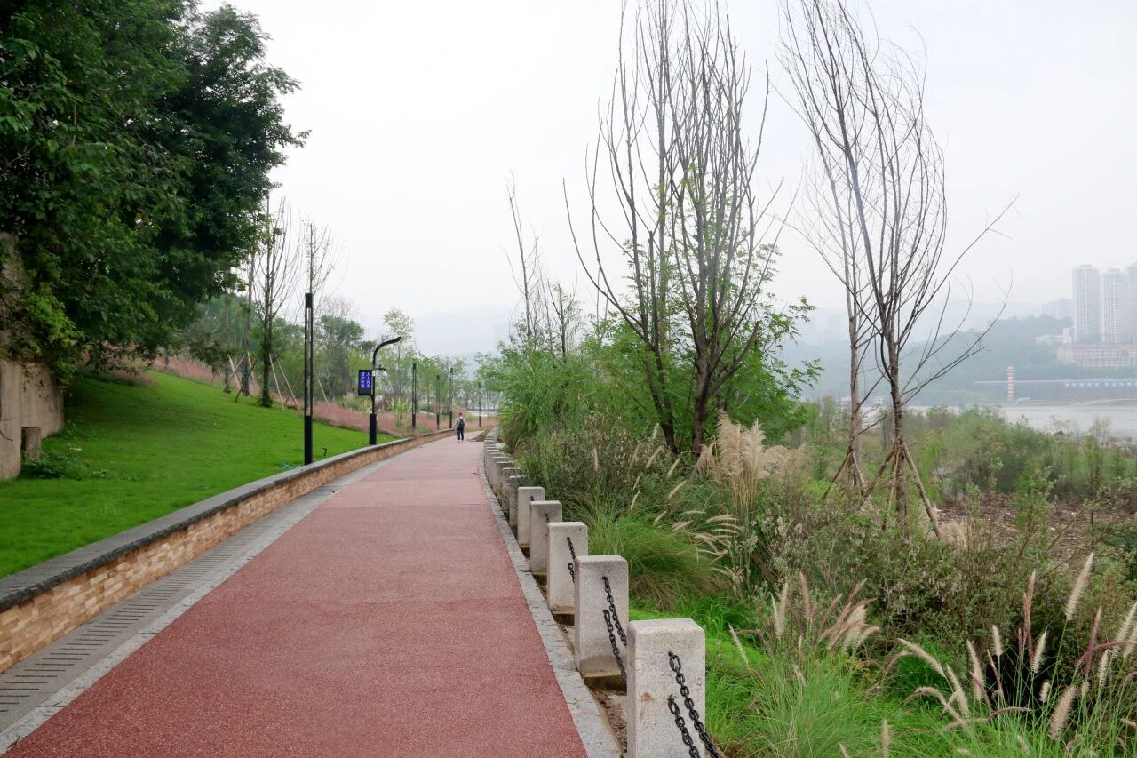 九龍半島段岸線起于漁秋浩碼頭,終于龍鳳寺,全線岸線長約6.8公里,面積約107.43萬平方米。地質條件復雜,季節性水位落差大,傳統的生態修復技術面臨嚴峻挑戰。項目團隊精準施策,巧妙采用了分級、分區域生態治理方案。在水位變動劇烈的消落帶,重慶建工三建公司的項目團隊攻克了土壤固結與植物存活難題,通過清渣換填、格賓網箱固土技術,并成功規模化種植秋華柳、卡開蘆等耐水植物,打造了一道“會呼吸”的生態屏障。在高程區域,優選本土植物,采用階梯式覆綠工藝,打造出四季有景、層次豐富的濱江綠化帶,顯著提升了區域的生態涵養能力。