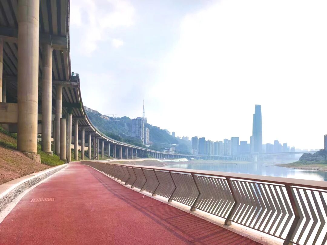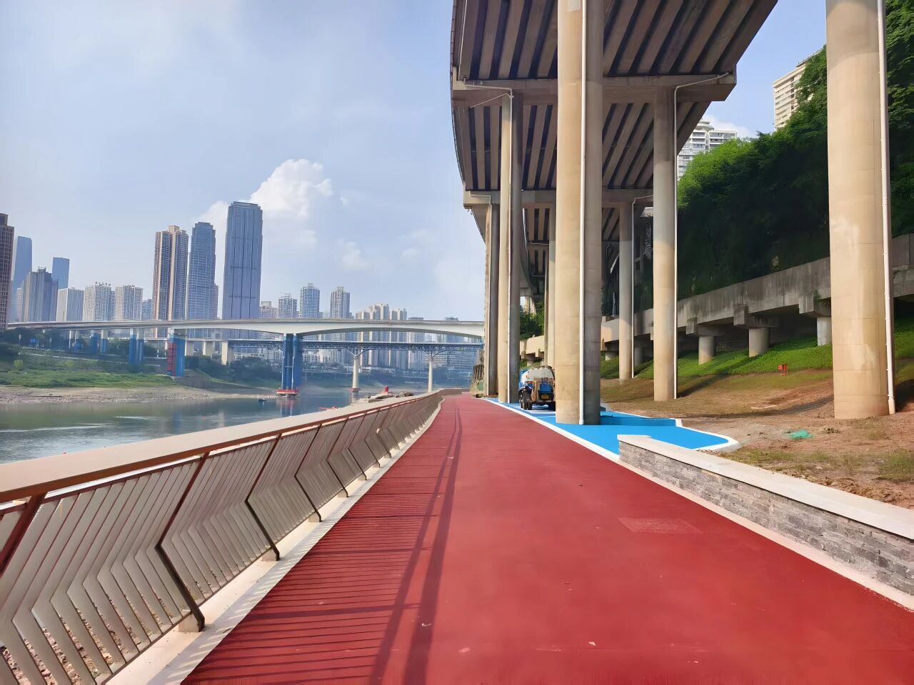 “我們通過把山城地貌與生態(tài)修復的巧妙融合,充分運用起橋下空間,真正兌現(xiàn)了那句俗語‘我走過的橋比你走過的路還多’!”項目團隊負責人驕傲地談起這個項目,“兩江四岸”是重慶最具標志性和辨識度的城市區(qū)域,也是城市發(fā)展的主軸。項目團隊巧妙利用高架橋下縱橫交錯的空間骨架,用紅色透水混凝土構(gòu)建起貫通的慢行濱江步道系統(tǒng),如絲帶般貫穿各功能節(jié)點,串聯(lián)起休閑廣場、觀景平臺與運動場地等功能區(qū)域,形成連續(xù)而富有變化的公共活動帶。實施期間,因為區(qū)域附近涉及多個旅游景點,項目團隊統(tǒng)籌安全文明施工與歷史文化保護,科學組織工序穿插,嚴格控制施工噪音與揚塵,最大限度減少對周邊環(huán)境與游客活動的影響。紅色濱江步道隨高差起伏延展,與階梯、坡道自然銜接,消弭了地形阻隔,提升了步行體驗。夜間燈光系統(tǒng)同步啟用,勾勒出步道輪廓,延續(xù)著山城晝夜不息的生活溫度。